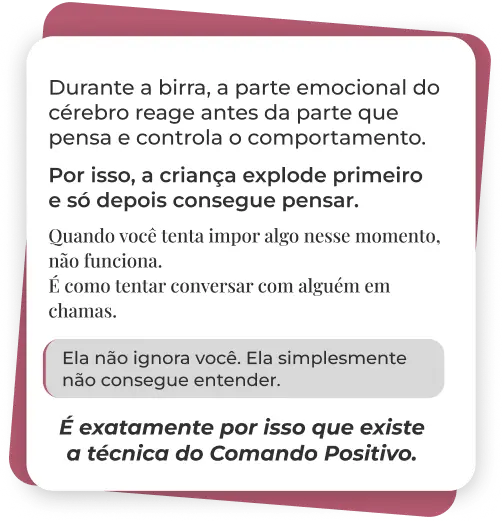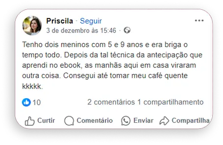 “Eu comprei sem muita expectativa porque já tinha tentado várias coisas antes, mas me surpreendi. As orientações são simples e fáceis de aplicar no dia a dia. Em poucos dias já senti menos resistência do meu filho e menos estresse aqui em casa. Recomendo muito pra quem tá cansada de gritar e não ver resultado.”